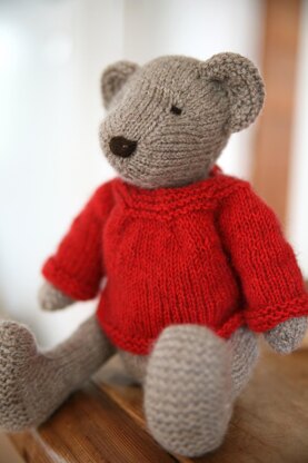 The wardrobe items included in this pattern are a scarf with pompoms, a jumper (worked in the round from the bottom up), and a buttoned jacket (worked from the top down). The jumper and jacket are constructed in the same way as ‘people’ garments, just in miniature. If you have wanted to learn a top-down or bottom-up technique then this is a quick and fun way to do it. Bear is very forgiving of mistakes and slight mishaps with gauge!