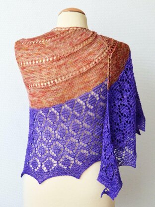 The shawl starts with a garter stitch tab. The body contains special shaping, which helps to avoid the “bump” in the upper edge of the shawl, so often present in crescent shawl designs. The lace in the border is knit on both right side and wrong side rows. The instructions for the border of the shawl are provided both fully charted and written out.