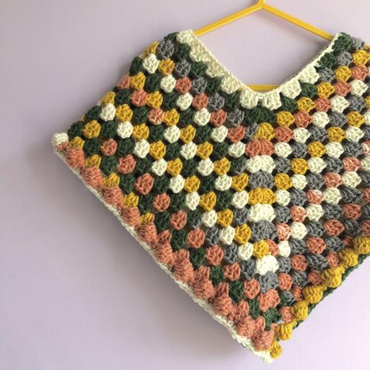 This quick and simple design creates a cute childs poncho in granny square style with bobble stitch trim. Using just 1 Paintbox Yarns Chunky pot, you get the beautiful colour changes with no ends to sew in! This size will fit toddler up to small child. You could increase the starting chain (multiple of 8) and add more rows to make a bigger size. Finish with optional fringing. Also works great using any 12 ply chunky yarn such as paintbox simple chunky or stylecraft special chunky