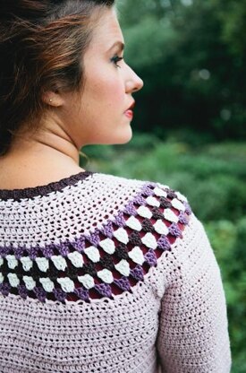 Worked in one piece, bottom up, the sleeves are worked separately and added on the body, before working the yoke, with granny stripe detailing.