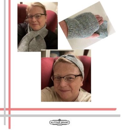This pattern is for absolute beginners. There are 3 delightfully simple patterns in glorious garter stitch that need no shaping. The mitts and head band come in small, medium, large and the scarf is one size.