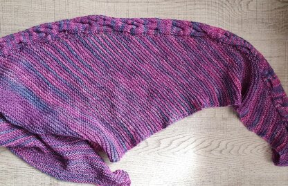 My finished sample shawl dimensions are: 125cm/49 inches along left hand edge; 74cm/29 inches along bind off edge; 135cm/53 inches along cable edge.