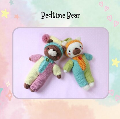 All parts are knitted flat and sewn up at the end. No circular knitting is required. The outfits are removable. The all-in-one is relatively simple. The buttonhole is not created, and the button is pushed through between the stitches. The hat has holes for the ears. The bear has mushroom-shaped eye beads sewn to the head. If you are using the safety eyes, attach them before stuffing the body. One size with a colour variation. The materials are to make two bears.