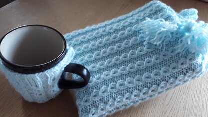 An easy knit mock cable patterned hot water bottle cover and matching mug cosy, an ideal bedtime treat. Perfect as a gift to give, knitted from just 200g, this amount will give more than one mug cosy.