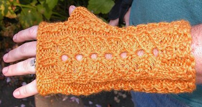 Lace Honeybees adorn the back of the hand with little Honeycomb cables on either side. The cuff begins with Honeycomb ribbing, which changes to a simple ribbing on the palm. Because these mitts are ribbed, they will stretch to fit a variety of sizes.