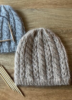 Knitted in the round from the bottom up, beginning with a rib which flows into the cable and slip stitch pattern and ends with a softly gathered crown worked on 5.5mm double pointed needles.