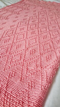 Ben's Blanket is both fully witen and charted. It is worked in one piece flat, or an in the round version. Only knit and purl stitches are required, and although it is written for dk yarn, it is written by st and row so any yarn may be used with slightly smaller than recommended needles. Yardage and size would then vary.