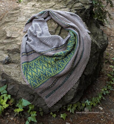 Berg Shawl is worked in rows back and forth bottom up. First the shawl’s body is made; then several mosaic panels are added. Finally, a small border is worked along two sides.