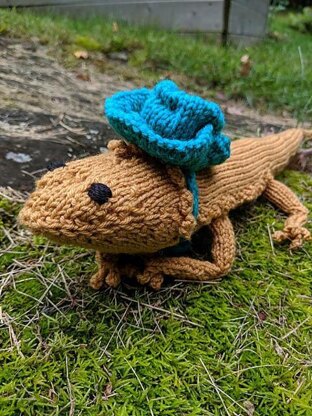 Bernard, the bearded dragon is knit from head to tail in one piece. Legs are knit separately and sewn on. Optional is to knit him a cowboy hat.