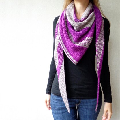 Berry Patch is a triangular, sideways, bias knit shawl with a curved top edge, which is worked in one piece from one tip to the opposite edge.