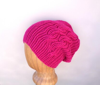 The large cables make a delight swirl design in this bold berry hat, a simple knit in single rib. Wear it cuffed or as a slouch hat.