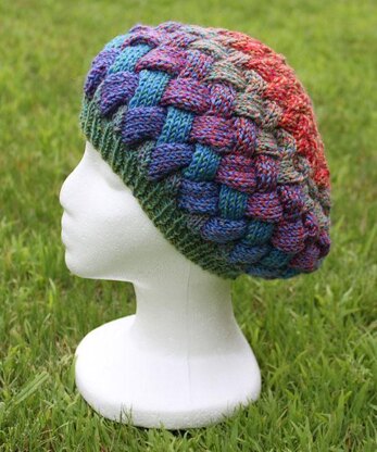 Item #: p-j-027 This Entrelac beret pattern is worked in the round from ribbing to crown, and is perfect for the slow color changes of Jojoland Rhythm (worsted) yarn or using a double-stranded method with Jojoland Melody (fingering). Since it is knit in the round, this entrelac pattern is extremely fast if a backwards knitting technique is used for all purls.