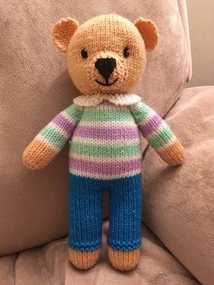 This pattern knits up a sweet little bear toy. It uses Hayfield Bonus double knit yarn (DK in the UK) and 3mm needles. I loved designing this little guy!