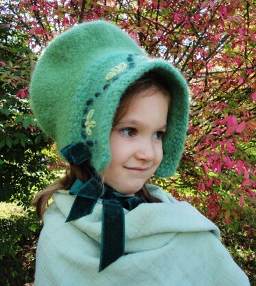 The Bertie Bonnet is a knitted and fulled bonnet of a prairie girl or French hand-sewn shape, offered in two sizes. Model shown is size LG and has ribbon ties and embroidered accents (very brief description of embroidery included in pattern.) This pattern uses two strands of yarn held together as one for the brim portion then changes to a single strand of yarn and smaller needles for the rise and crown. Started by knitting in rows on a flat piece, the shaping eventually changes to circular knitting for the puffed effect and decreasing which sweetly shapes the crown at the back of