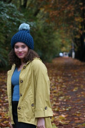 This is an uncomplicated hat made in two pieces and seamed on the sides for added stability. The pompom makes it fun; the slightly thick & thin quality of the original yarn used (along with the yarn's great colorways) makes for nice texture and super color atop your head.
