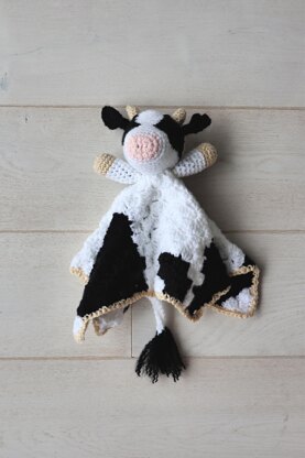 Now back to Bessie... shes about 15 inches (40cm) wide, she has an oversized head with ears and horns and a cute little fluffy tail. If you flip through the photos you'll see Bessie in her two configuration options: a traditional lovey and what I'm calling a "crib draper." Both styles just depend on where you seam her little arms and head. And both configurations are clearly spelled out in the pattern so you can choose the one that your baby recipient will like best!