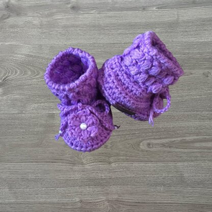 Create cosy baby booties worked seamlessly from the sole up with no side seams, sized by hook from preemie to 12 months, with a raised puff-stitch flower motif on the front. The booties are comfortable to wear and make thoughtful handmade baby gifts, perfect for everyday outfits and matching crochet sets.