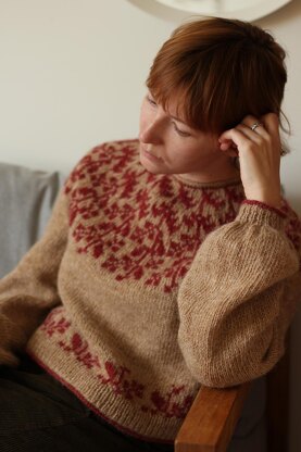 This romantic cropped pullover with a round yoke and blouse-like balloon sleeves features a floral colour work pattern running around the yoke and along the hem. Inspired by the invisible movements of flowers in search of light. The yoke is worked from a provisional cast-on bottom up in the round, whereas the body and sleeves top down. An alternative to knit the yoke top down is also provided.