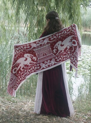 With medieval-style dragons and castles, this shawl is a fantasy lover’s delight! It’s knitted entirely in the round, with the fringe built in as you go. This pattern features the easiest steek imaginable - the steek becomes the fringe; you just cut it up the middle and knot the strands to finish!