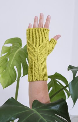 These modern hand warmers feature a graphic pattern of cables that appear to ‘grow’ out of the twisted rib cuff, then travel at crisp angles across the back of the hand. This pattern includes three style options—fingerless mitts, fingerless gloves, and full gloves—and is written in a range of four sizes, to fit a wide array of hands, with easy-to-adjust lengths to help ensure a perfect fit.