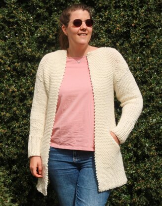 PATTERN DETAILS • Cross between a coat and a cardigan, cozy yet elegant • Size XS to 5 XL (details below) • Beginner-friendly • Insert pockets • Worked in panels sewed together • Techniques used / Special stitches: Full explanations are given in the pattern. • Illustrated step-by-step photos /MATERIALS • 10 mm/ US 15 knitting needles. I used circular needles for convenience, but you don’t need them. • Zeeman Ayla (Bulky weight 5, 100% acrylic, 115m /126yd, 100g/3.5oz) in off white colorway • Tapestry needle to weave in the ends