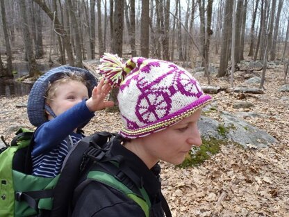 This whimsical hat is knitted in the round. Pompom in all three colors is added. Fits heads of 19"- 23" (48 - 58cm) in circumference. Finished unstretched measurement at brim: approximately 16" (41 cm) small, 18" (46 cm) medium, and 20" (51cm) large in circumference, unstretched. The Bicycles are knitted in stranded colorwork technique with carrying the yarn behind the work, following the charts or written direction. An alternative solution is to replace CC with MC and then duplicate stitch the CC onto the hat.