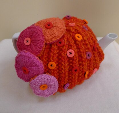 This tea cosy is a simple knit and features a collection of lovely decorative felt buttons stitched all over the knitting. To highlight the knitting four big knitted buttons cascade down one side of the cosy. You can with knit these in one colour or you can make each side a different colour to reflect the felt buttons. I have knitted in shades of Orange, Reds and Pinks but obviously you can choose your favourite colours. The main part of the cosy is knitted in double thickness yarn to keep your pot nice and hot. If you dont like the felt buttons you could also use real buttons. Just make a quick trip to your local haberdashery.