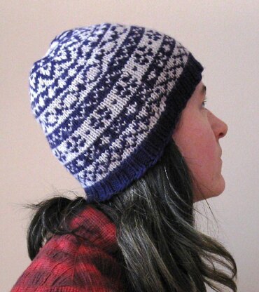 This hat started out as a couple of colours in my scrap collection that looked pretty together. I used them to knit a striped stranded hat for a friend’s baby. Then I decided I wanted a big version for myself. (Baby and I live in different cities. I don’t think he’ll be too embarrassed.)