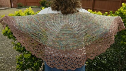 This is a half circle shawl knit from the top down. The body is garter and eyelets, the edging is lace. The body instructions are written. The edging instructions are both written and charted.
