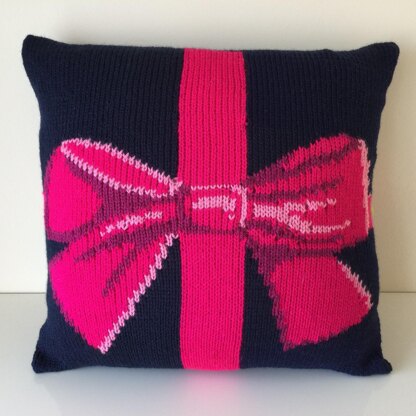 Cushion cover knitting pattern of a parcel wrapped in a big bow! This can be used to cover a cushion pad, or a box canvas if you’d prefer to display your hard work on the wall and have a unique piece of art! This pattern is an instant download and includes all the instructions you need Finished piece measures 40x40cm knitted in one piece in Double Knitting yarn with a 5 button opening at the back when sewn up Materials Required: DK Yarn 1 x pair 4mm knitting needles (6 US, 8 Old UK) 5 x buttons (approx 23mm diameter) 1 x cushion pad 40cm x 40cm (16” x 16”), or 1 x stretch or box canvas 40cm x 40cm