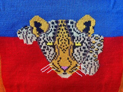 The Leopard motif was added using Swiss Darning/ duplicate stitch from the chart after the background had been knitted. The, optional, whiskers were added using back stitch. You could add the motif using the intarsia method from the chart as you knit.