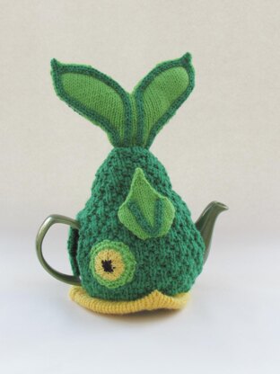 Not really modeled on any particular breed of fish; the fish cosy has big yellow lips, and a green body. To create the appearance of scales I knitted the main part of the cosy in a textured stitch.