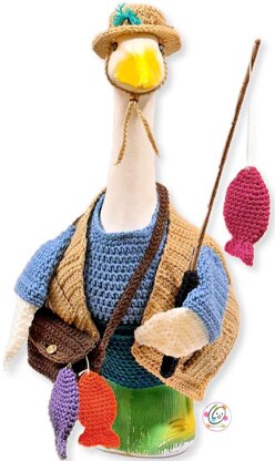 Sample yarns: Red Heart With Love Bluebell (shirt), Red Heart Super Saver - Teal (pants), Buff (vest and hat); Mainstays Brown (bag); Misc yarns for fish and ties on hat.