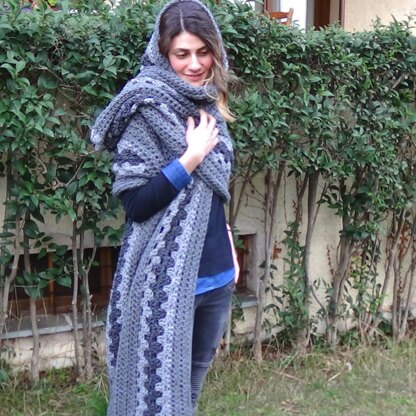 It is an easy crochet pattern and the technique used is sc, hdc, dc. It can be worn simply draped over the shoulders and having the armholes it is secured and stands well on the body. It can be wrapped across the front of the body to cover the chest and neck. Big Granny Shawl adds a touch of bohemian elegance to any ensemble. No sewing is required. Needs about 5 hours. It works up fast.
