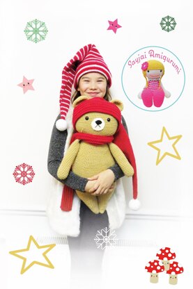 Crochet pattern to create a large bear with 2 Christmas hats and a scarf. The hat also fits a little girl.