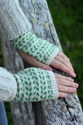 Bands of bilberry leaves wrap around these mitts, creating a pretty pattern and extra warmth due to the stranded inside. These mitts are quick to knit with fun colour work to keep you engaged. The mitts are finished with a twisted rib cuff at the wrists and band across the fingers.