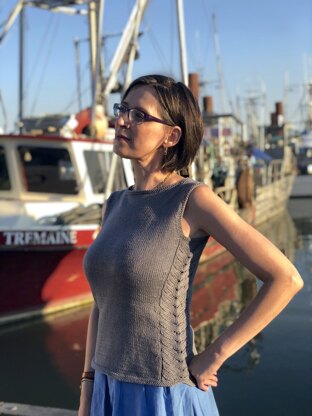 Billhook is a tank top with an elegantly shaped hemline. Intended to be worn with little to no ease, it is worked in the round from the bottom up with waist shaping that is further defined by the Billhook Lace pattern that runs up the sides. The front shoulders wrap around to the back in an English tailored shoulder for a clean fit.