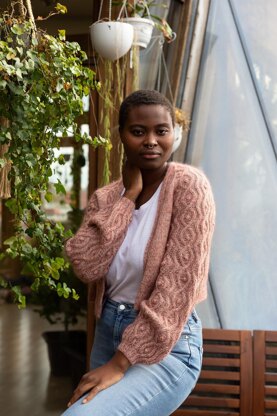 Bindweed is knit from the top down as a seamless raglan. The front sections and the back are worked in stockinette, and balloon sleeves are richly decorated with a pattern of intertwined cables and nupps. The side border of the cardigan is knit at the same time with the body and has a small cable running along a few 2x2 rib stitches. The bottom is finished with a folded stockinette hem. Both the charts and the written row-by-row instructions are provided.