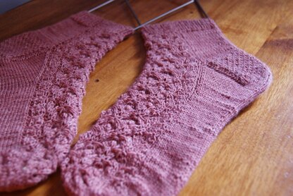 These socks contain a large main pattern, as well as a small pattern on each side that starts in the ribbing and ends at the tip of the foot. The lace stitches are a bit difficult to execute, especially because of the relatively tight gauge you want to have in a sock. The work is therefore longer than for normal socks, but the result is so satisfying!