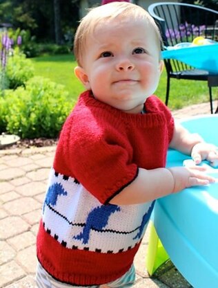 This adorable children's raglan sweater features top down construction. The whimsical pattern is knit using the Intarsia technique. Shown with short sleeves, instructions for a long sleeved version are included.
