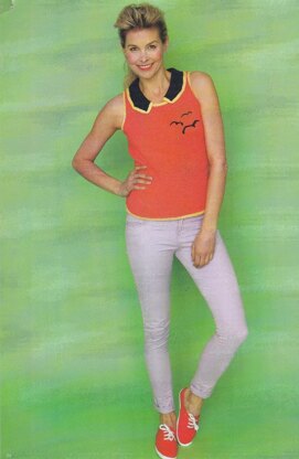 This is a pattern for a Birds Top, originally published in Knitting magazine. It is in stocking stitch with garter stitch edgings, contrast collar and edges. The birds are Swuss darned after knitting on the front, following a chart. The yarn is now discontinued. Any yarn knitting to the tension 22/30 can be used. Photos Laurel Guilfoyle for Knitting.