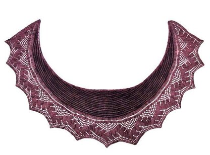 This shawlette can be made in any thickness of yarn and the size varied by the number of “points” in the border – this is made first, in a sideways band, and the top section, striped or in a single colour, is then picked up from the straight side of this band. The pattern is given in text and chart form, with photo tutorial on intarsia techniques. Three samples are given in the pattern to show the effects of using 10 ply worsted, 4 ply fingering and 2 ply lace-weight yarns. The 2 ply lace sample (very delicate and light – lovely as a neck scarf) used 40 gms 2 ply Malabrigo Lace and 10 gms silk wool mix on 3.25 (US 3) mm needles; 4 ply/fingering sample used 105 gms skein of Indigodragonfly MCN sock yarn plus 25 gms Malabrigo lace used double on 3.75 (US 5) mm needles; and the 10 ply worsted version (a warm shoulder wrap) used 165 gms Cascade Eco Alpaca plus 35 gms of the same yarn in a contrast colour on 4.5 (US 7) mm needles.