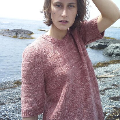 This sweater uses a simple reverse stockinette stitch for enhanced texture, particularly when using a more rustic yarn, such as in the sweater shown here. Edged in twin rib, the front, back and sleeves are knit separately from the bottom-up and seamed. Finally, the neckline is