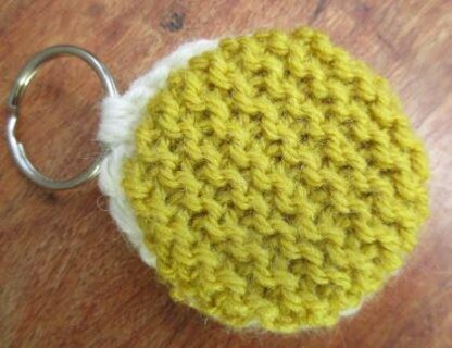 This is a pattern for a Biscuit Keyring. It is a quick and easy project, and a good way to use small amounts of left over yarn. The main part is in garter stitch, with a split ring or lobster clasp keyring.