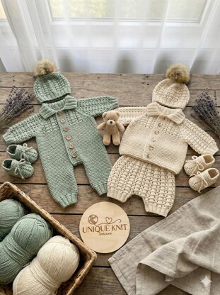 This simple yet modern design has a collection of pieces suitable for a newborn baby or reborn doll. All main pieces are knitted on straight needles from the top down with line by line instructions, making this an easy pattern to follow and has minimal sewing so nice and comfy is making this for a baby With full instructions to make the Romper, Cardigan, Shorts, Hat, and little booties.