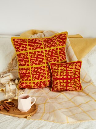 The cushion cover is worked in one piece, in mosaic garter stitch, with attached i-cord edgeing. Reversing the main colour and the contrasting colour adds visual effect. The pattern is for the front of the cushion cover only. You need a premade cover to sew it on.