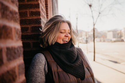 The Black Moon Cowl is worked flat beginning at one corner and shaped with increases and decreases. Finished in pattern with an i-cord edge, once complete, the cowl is seamed after blocking.