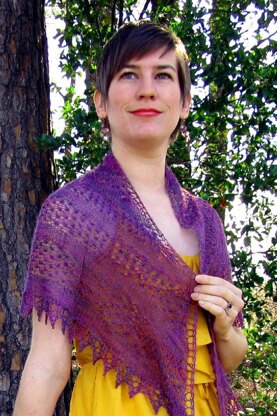 Blackberry Mist Shawl is a triangle shawl worked from the top down in alternating stripes of Blackberry Lace and Stockinette Stitch. The bottom edge is finished with a knitted on scalloped lace border. Size can be adjusted by working more or fewer repeats of Blackberry Lace Stripe and Stockinette Stitch Stripe. Stitch patterns are written and charted.