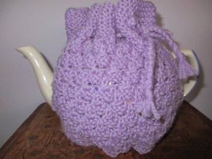 This is a pattern for a blackberry stitch tea cosy. This was originally designed for Future publishers as part of a bookazine of beginners knits. It has a blackberry stitch as the main part, with garter stitch borders, eyelets and a plaited tie.