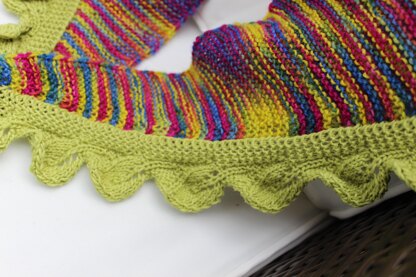 Im letzten Jahr habe ich den Tarotgarten von Niki de Saint Phalle in der Toskana besucht. Die Farbenvielfalt ihrer esoterischen Skulpturen hat mich zu diesem Tuch inspiriert. Durch die Blattbordüre, die direkt mitgestrickt wird, erhälst du ein sehr schönes Accessoire, mit dem du viele deiner Kleidungsstücke aufpeppen kannst.